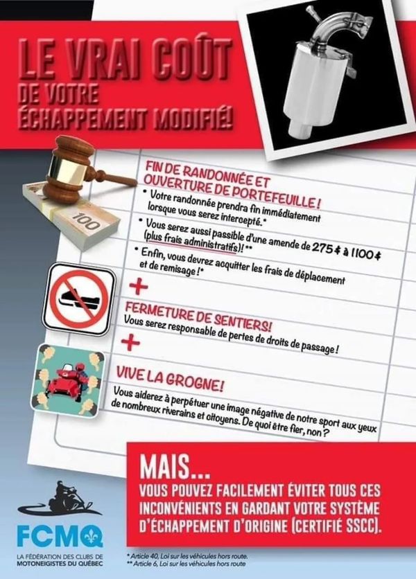 Nul ne peut effectuer ou faire effectuer sur un tel véhicule une opération visant ou ayant pour effet de supprimer ou de réduire l’efficacité du système d’échappement de ce véhicule, de le rendre plus bruyant ou d’augmenter les risques de brûlures, par rapport à celui installé par le fabricant ou celui exigé par règlement du gouvernement. Nul ne peut vendre ou distribuer un équipement visant à ou ayant pour effet de supprimer un système d’échappement ou d’en altérer le bon fonctionnement.